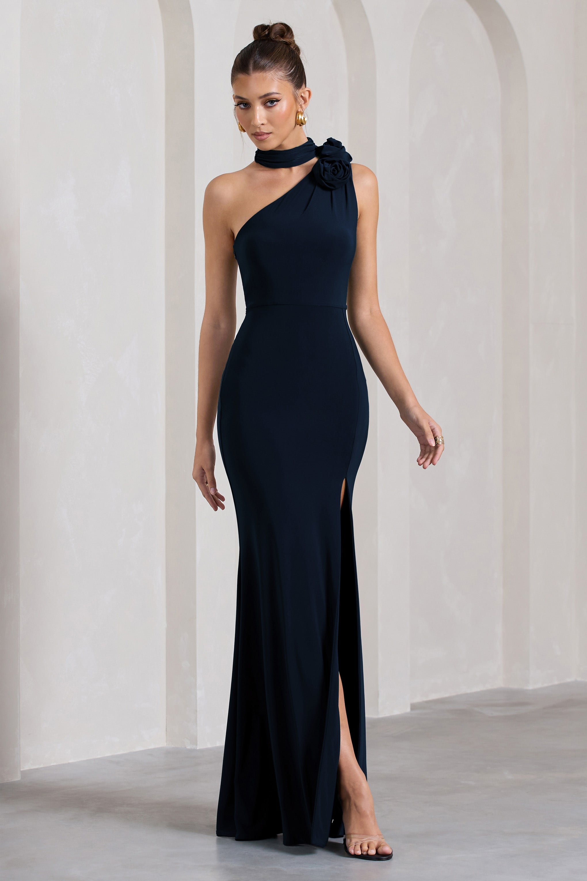 Suspense'de | Çiçek Detaylı Lacivert Tek Omuz Halter Yırtmaçlı Maxi Elbise