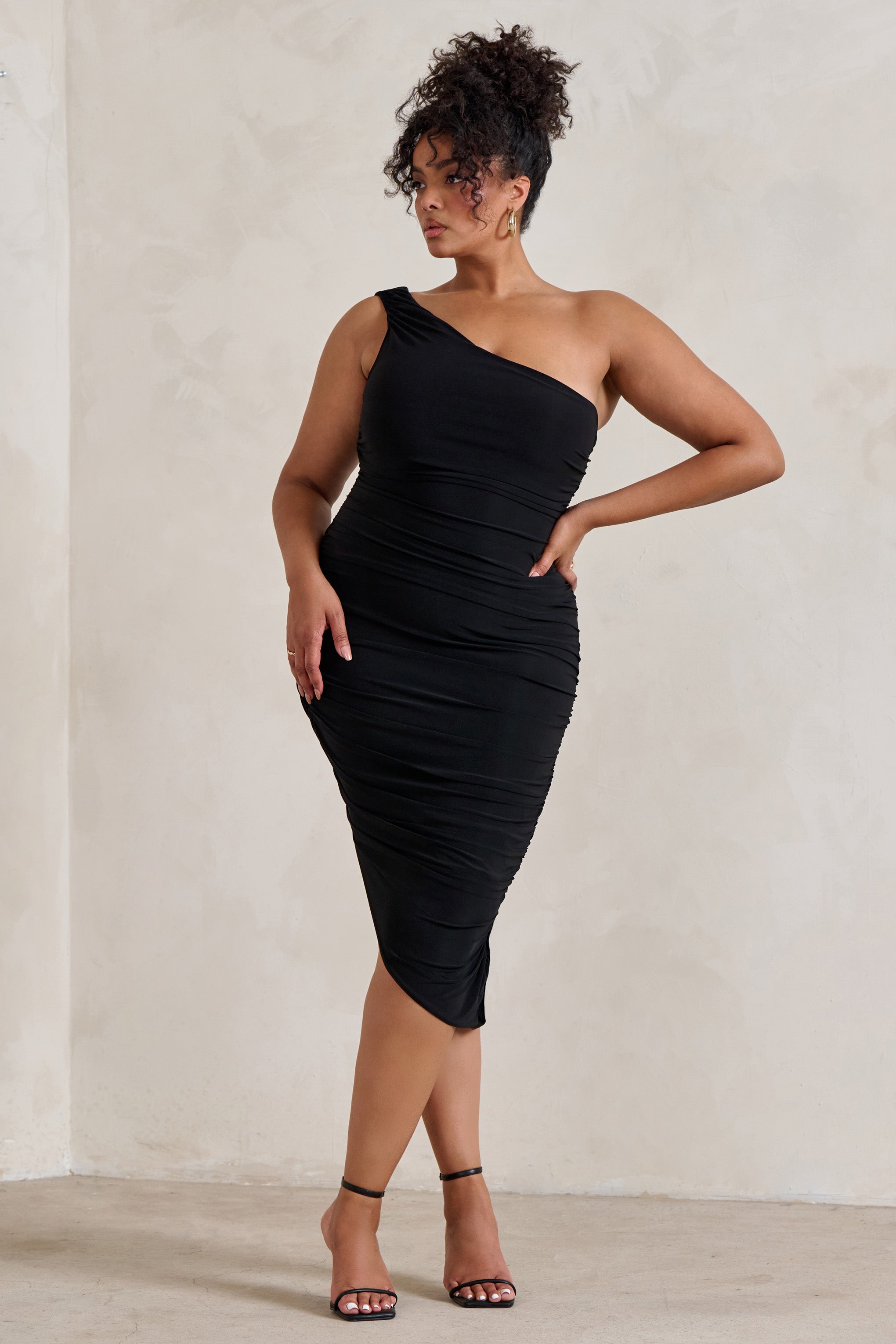 Gece Yarısı | Siyah Asimetrik Tek Omuz Ruch Midi Elbise