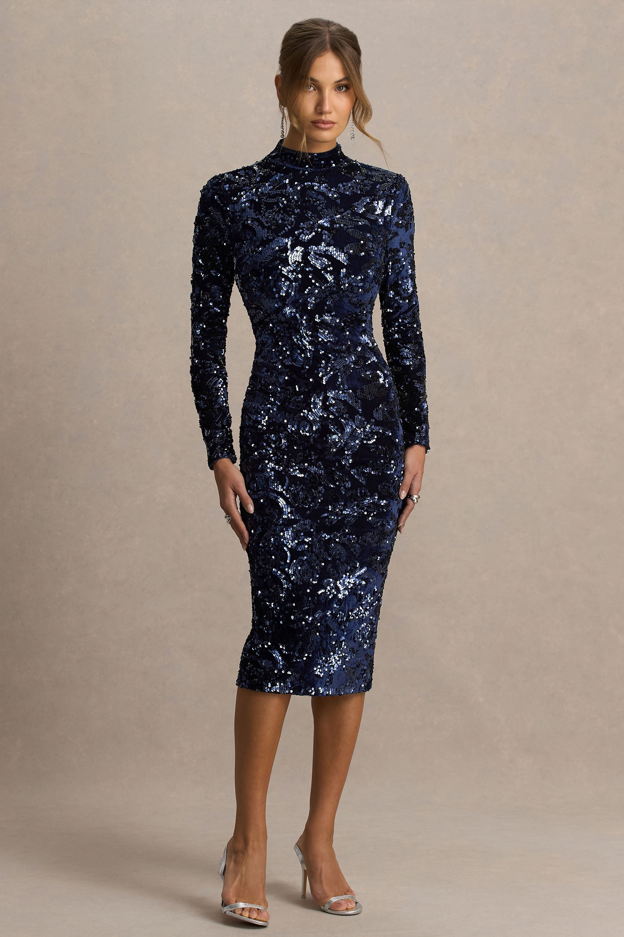 Alanita | Lacivert Kadife ve Pullu Yüksek Yaka Midi Elbise Uzun Kollarla