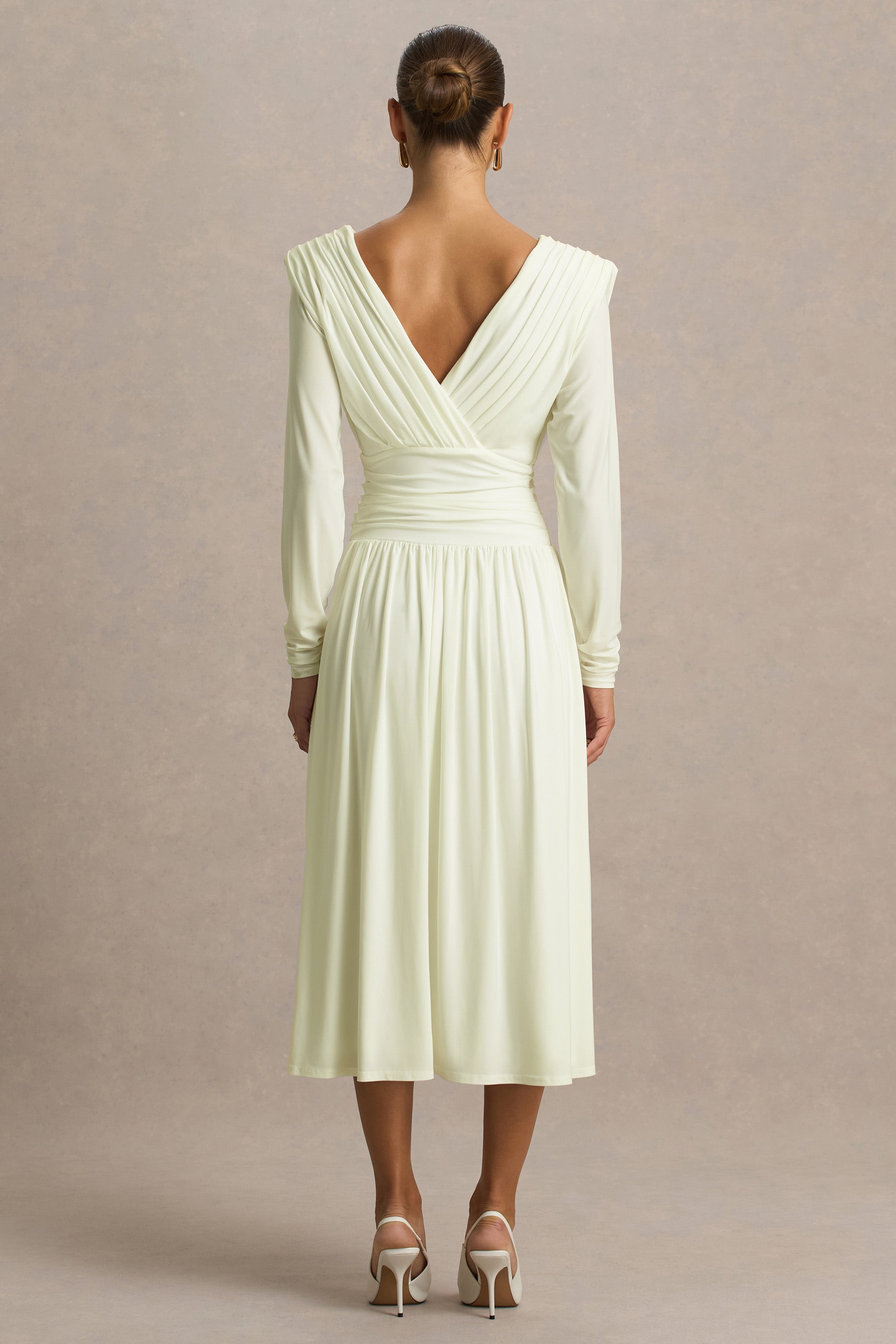 Alexis | Drapeli ve Fırfırlı Detaylı Krem Derin Yırtmaçlı Midi Elbise