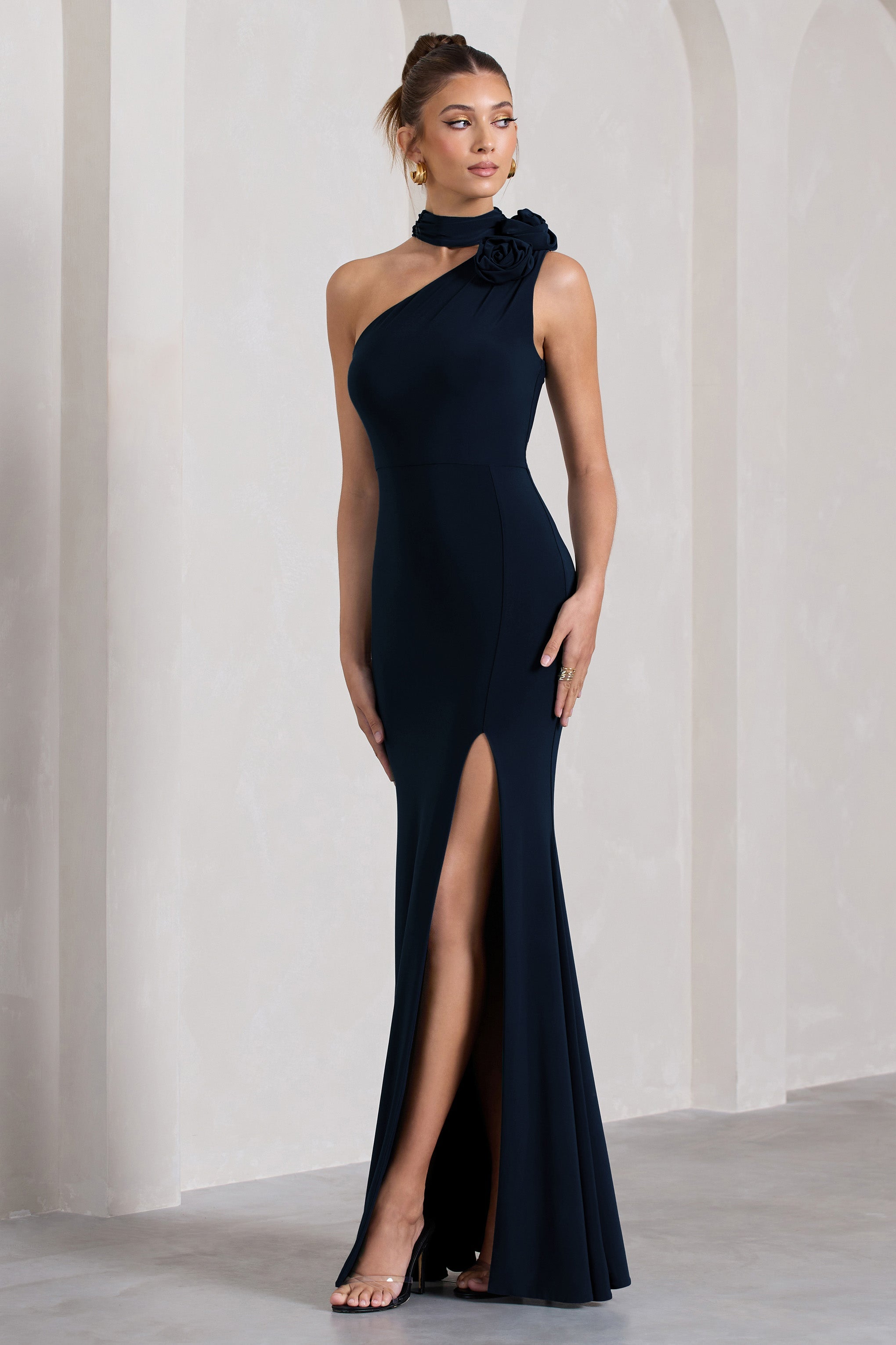 Suspense'de | Çiçek Detaylı Lacivert Tek Omuz Halter Yırtmaçlı Maxi Elbise